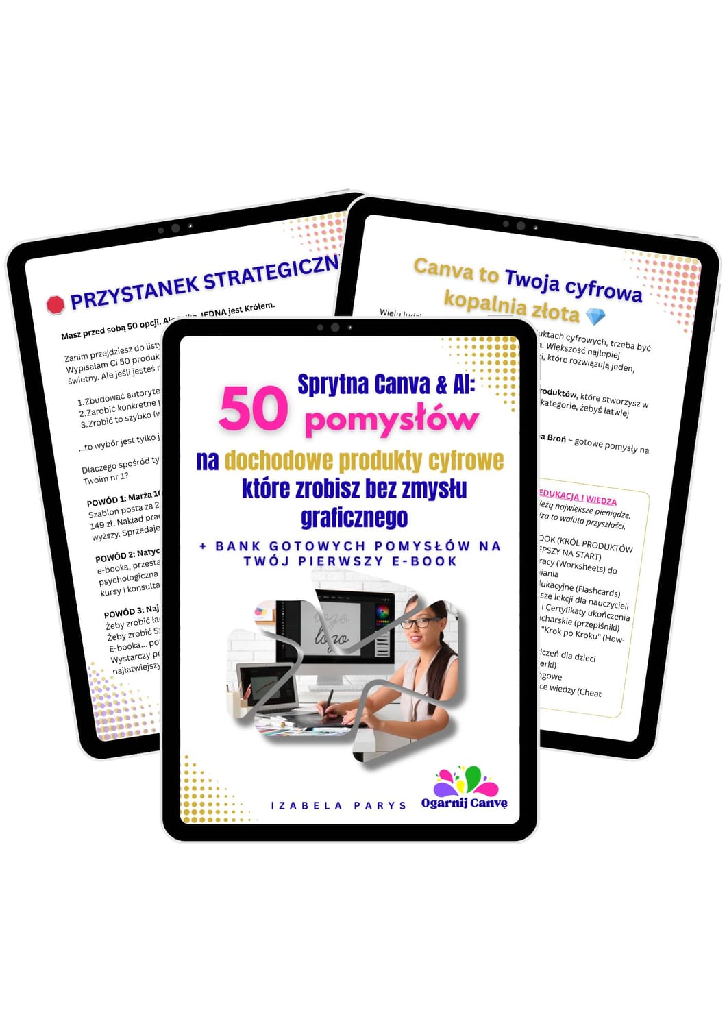 "Sprytna Canva & AI: 50 pomysłów na dochodowe produkty cyfrowe, które zrobisz bez zmysłu graficznego + pomysły na Twój e-book",